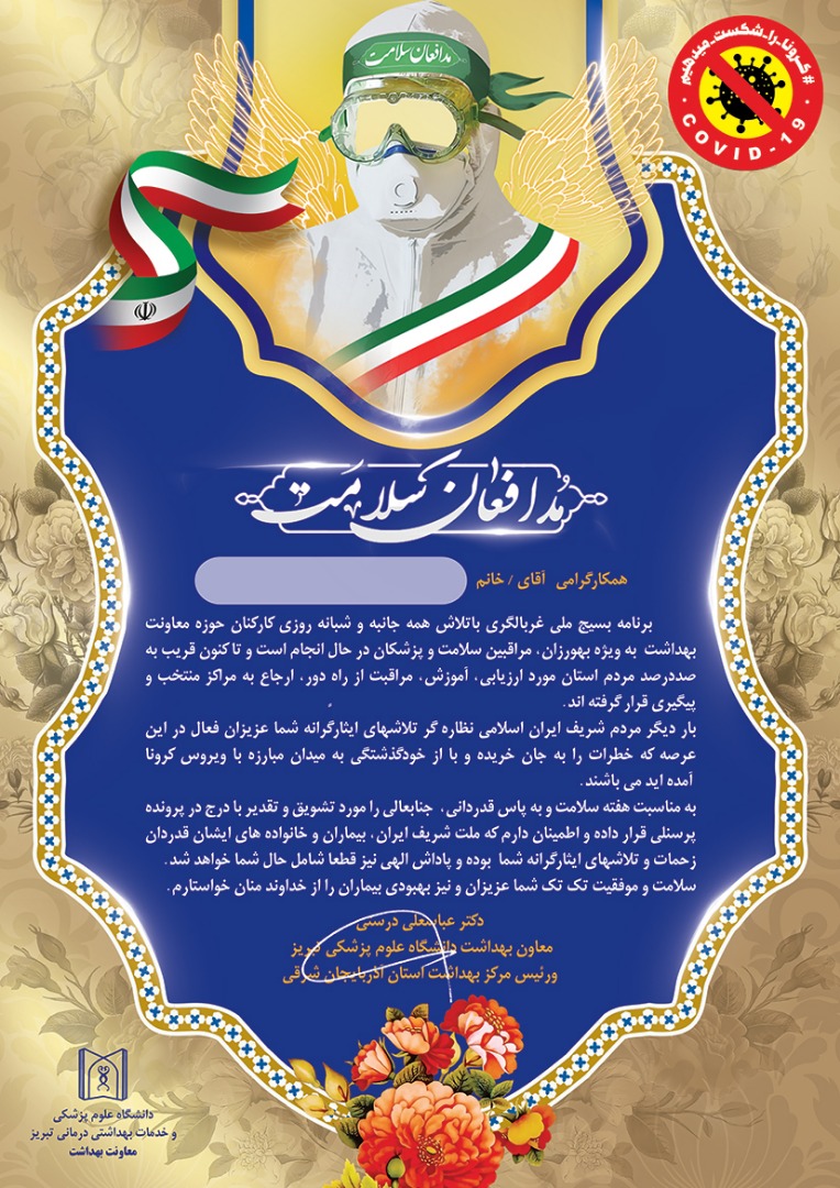 بار دیگر مردم شریف ایران اسلامی نظاره گر تلاشهای ایثارگرانه شما عزیزان فعال دراین عرصه که خطرات را به جان خریده و با از خودگذشتگی به میدان مبارزه با ویروس کرونا آمده اید می باشند.