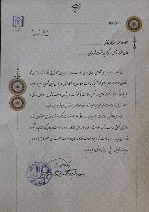 لازم می دانم به مناسبت فرا رسیدن روز جهانی ماما ، از زحمات پیگیر و شبانه روزی حضرتعالی که در راستای تحقق اهداف برنامه سلامت مادران حماسه ای ماندگار در عرصه سلامت برجای گذاشته اید، تشکر و قدردانی نمایم . امید است که در پرتو الطاف خداوند منان و عنایت حضرت ولی عصر( عج ) در انجام وظایف خویش بیش از پیش موفق و موید باشید.