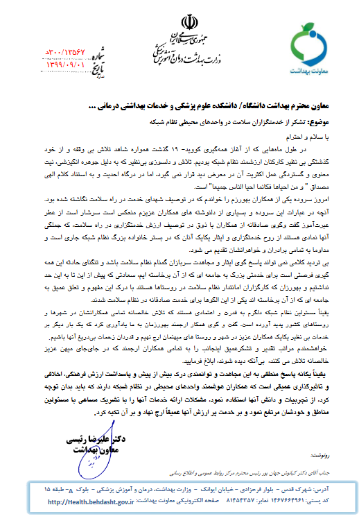 موضوع: تشکر از خدمتگزاران سلامت در واحدهای محیطی نظام شبکه