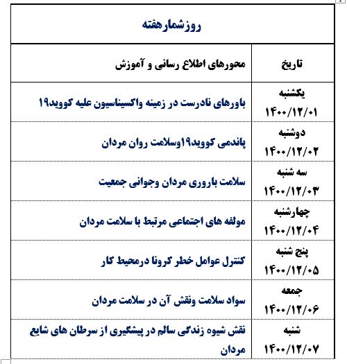 وی با بیان اینکه شعار امسال هفته ملی سلامت مردان ایران "مشارکت مردان، واکسیناسیون حداکثری(کرونا)، محافظت جمعی" است، اظهار کرد: روز یکشنبه یکم اسفندماه به عنوان "باورهای نادرست در زمینه واکسیناسیون علیه کووید۱۹"، دوشنبه دوم اسفندماه به عنوان "پاندمی کووید۱۹ و سلامت روان مردان"، سه شنبه سوم اسفندماه به عنوان "سلامت باروری مردان و جوانی جمعیت"، چهارشنبه چهارم اسفندماه به عنوان "مولفههای اجتماعی مرتبط با سلامت مردان"، پنجشنبه پنجم اسفندماه به عنوان "کنترل عوامل خطر کرونا در محیط کار"، جمعه ششم اسفندماه به عنوان "سواد سلامت و نقش آن در سلامت مردان" و شنبه هفتم اسفندماه به عنوان "نقش شیوه زندگی سالم در پیشگیری تز سرطانهای شایع مردان" نامگذاری شده است.