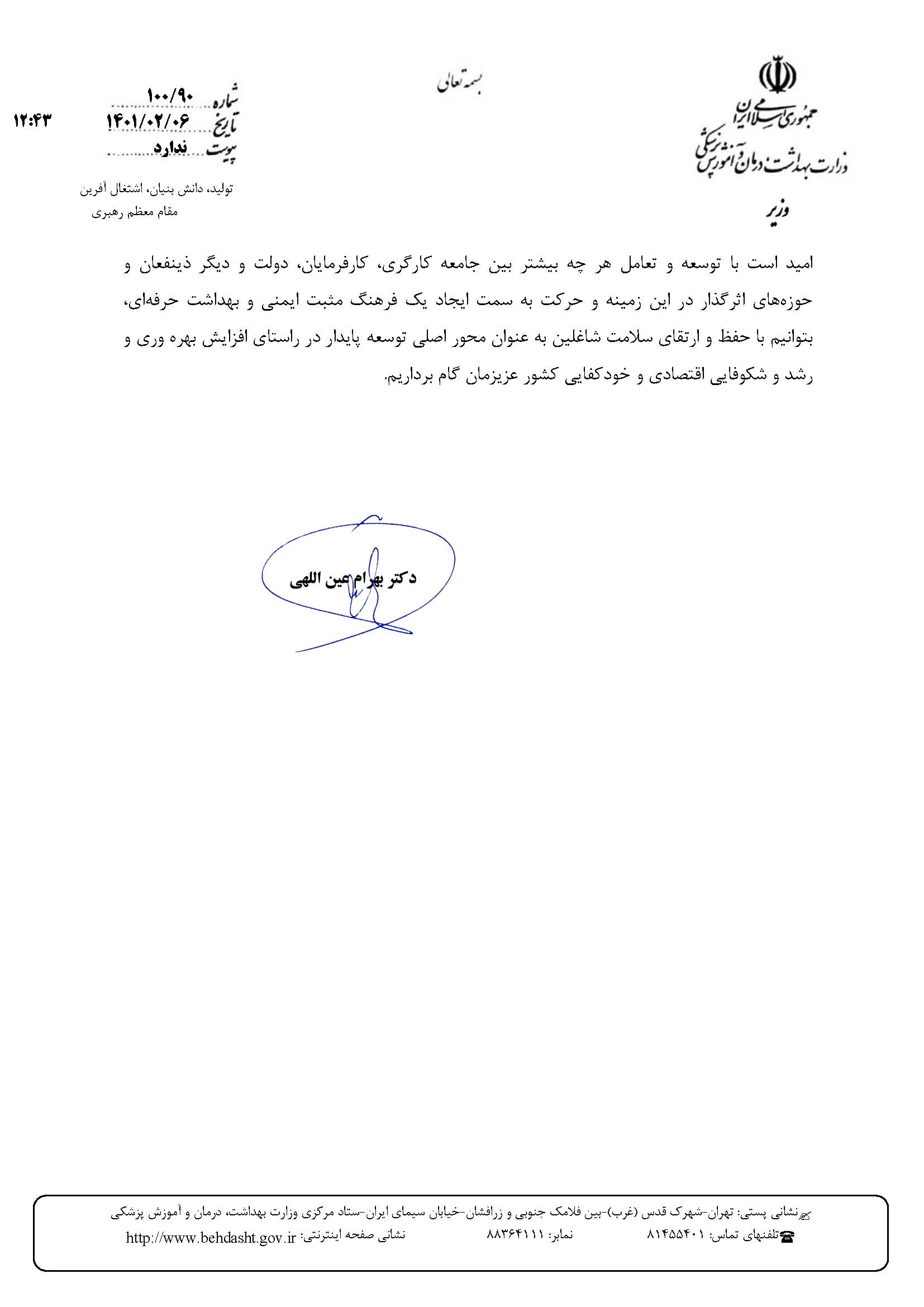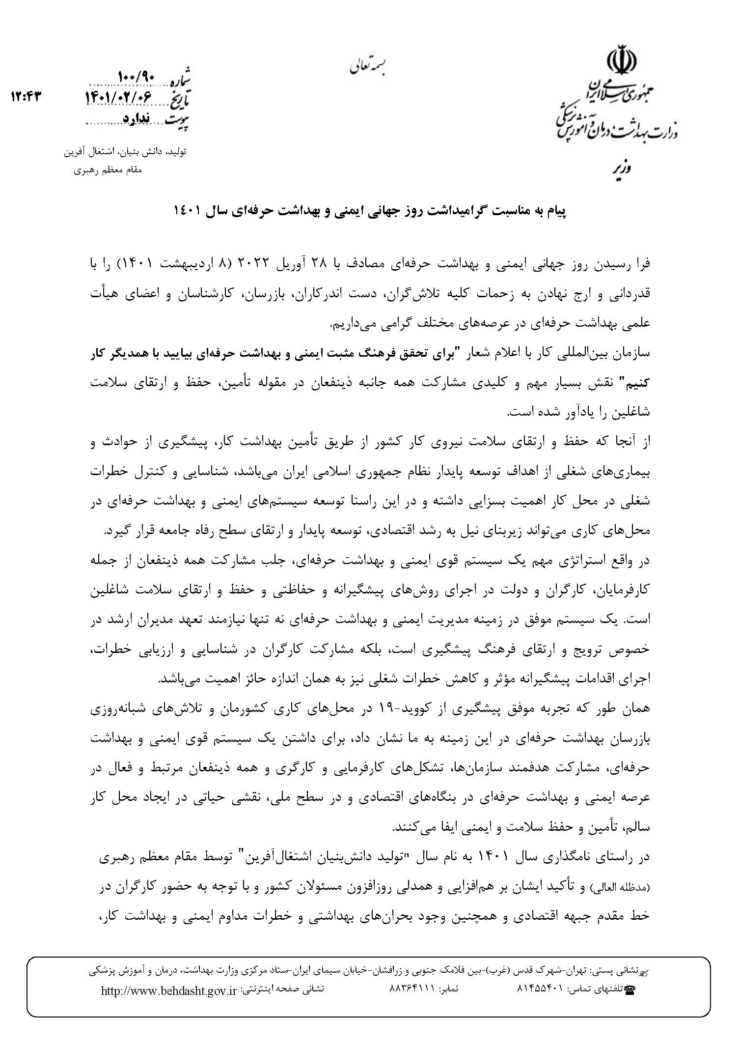 پیام وزیر بهداشت به مناسبت روز جهانی بهداشت حرفه ای 1401