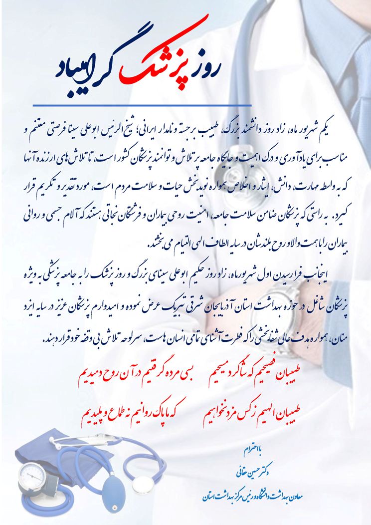 پیام تبریک معاون بهداشت دانشگاه علوم پزشکی تبریز به مناسبت یکم شهریور روز پزشک و بزرگداشت ابوعلی سینا