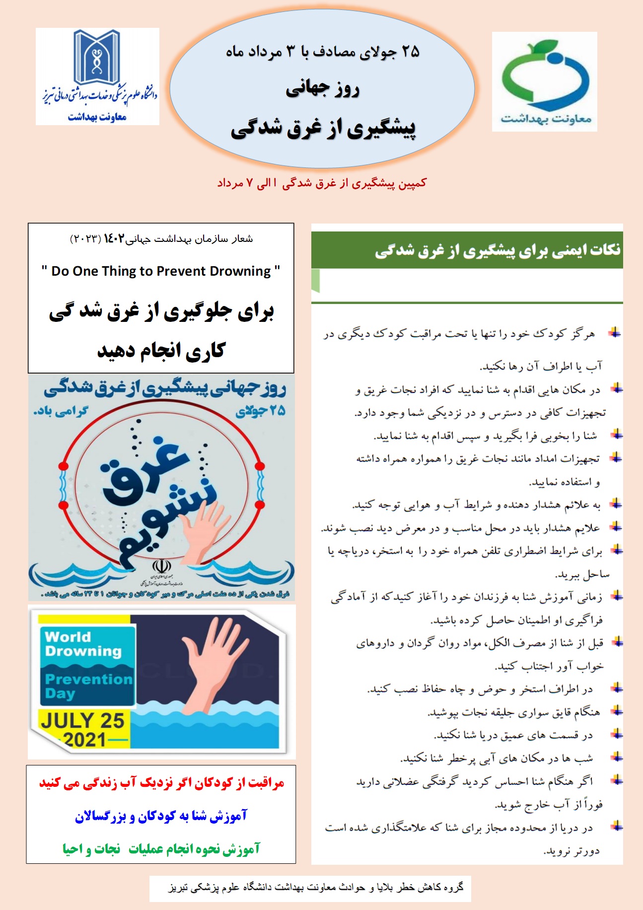 به گزارش روابط عمومی مرکز بهداشت استان آذربایجان شرقی به نقل ازگروه کاهش خطر در بلایا و حوادث معاونت بهداشت دانشگاه علوم پزشکی تبریز مجمع عمومی سازمان ملل متحد در آوریل ۲۰۲۱ ،روز ۲۵ جولای هر سال مصادف با ۳ مرداد ماه به عنوان روز جهانی پیشگیری از غرق شدگی اعلام شده است.