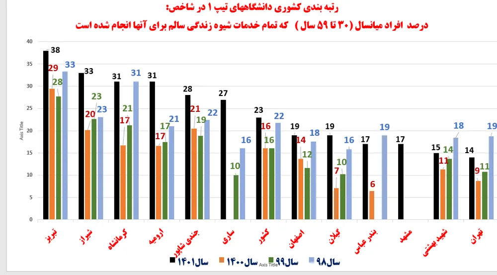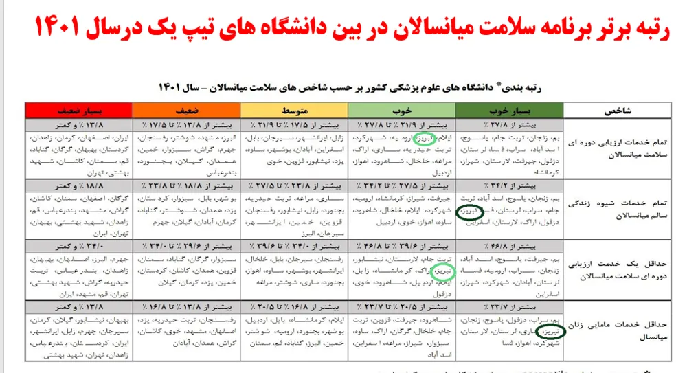 به گزارش روابط عمومی مرکز بهداشت استان در رتبه بندی دانشگاههای کشور برحسب شاخص های برنامه سلامت میانسالان در سال 1402 که توسط اداره سلامت میانسالان مرکز جوانی جمعیت، سلامت خانواده و مدارس وزارت متبوع اعلام شده است، معاونت بهداشت دانشگاه علوم پزشکی تبریز عنوان برتر کشوری را در بین دانشگاههای تیپ یک کسب نموده است.
