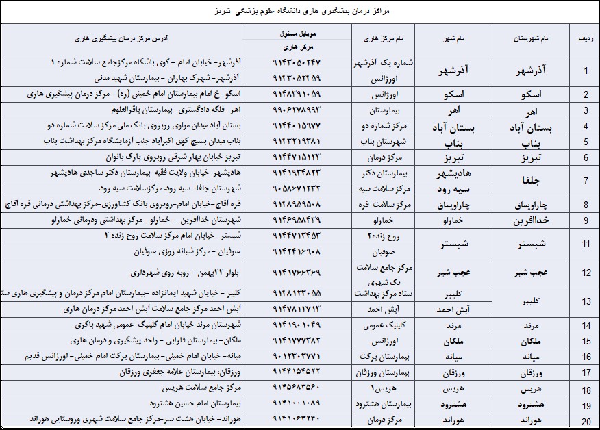 آدرس مراکز درمان و پیشگیری از هاری در مراکز بهداشت شهرستانها