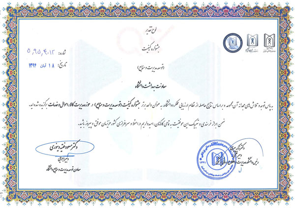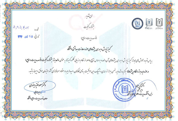 در حیطه ایده برتر ذهن خلاق (نظام پیشنهادات)، در زمینه کمیته برتر در پذیرش و بررسی پیشنهادها، ضمن تقدیر و تشکر از کمیته های اداره امور آزمایشگاه های استان و کمیته حوزه معاونت درمان کمیته حوزه معاونت بهداشت دانشگاه به عنوان کمیته برتر معرفی شد.