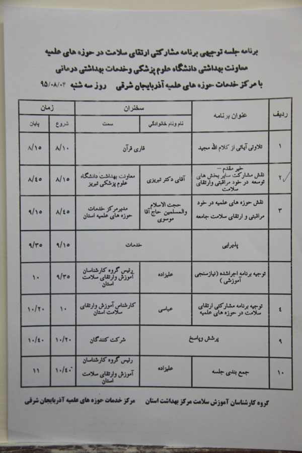 علیزاده رئیس گروه کارشناسان آموزش و ارتقای سلامت مرکز بهداشت استان نیز درمورد نتایج نیازسنجی آموزشی انجام گرفته از گروه های هدف مرکز خدمات حوزه های علمیه اطلاعاتی را ارائه نمودند.