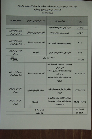 کارگاه آموزشی کارگاه پیشگیری از بیماریهای قلبی عروقی و عوارض آن(2) و محاسبه فرامینگهام با شرکت کلیه کارشناسان مسئول بیماریها و کارشناسان بیماریهای غیرواگیر شاغل در شبکه های بهداشت و درمان شهرستان ها در محل سالن شماره 2 مرکز بهداشت استان برگزارگردید.