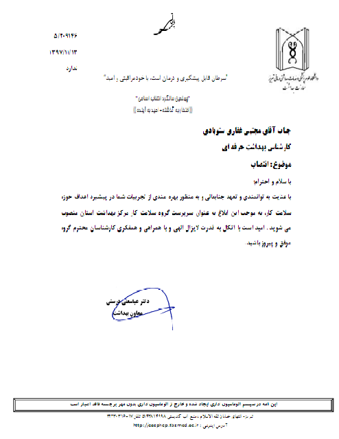 با عنایت به توانمندی و تعهد جنابعالی و به منظور بهره مندی از تجربیات شما در پیشبرد اهداف حوزه سلامت کار، به موجب این ابلاغ به عنوان سرپرست گروه سلامت کار مرکز بهداشت استان منصوب می شوید. امید است با اتکال به قدرت لایزال الهی و با همراهی و همفکری کارشناسان محترم گروه موفق و پیروز باشید.